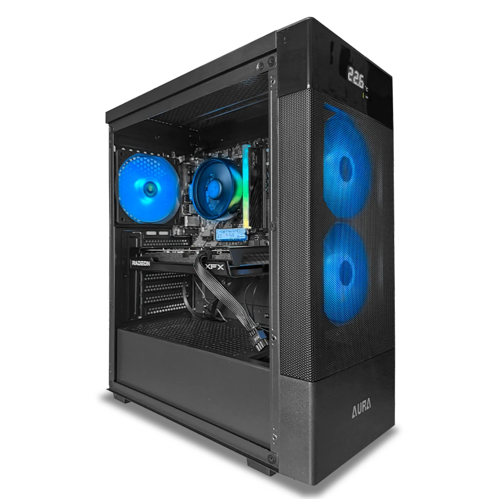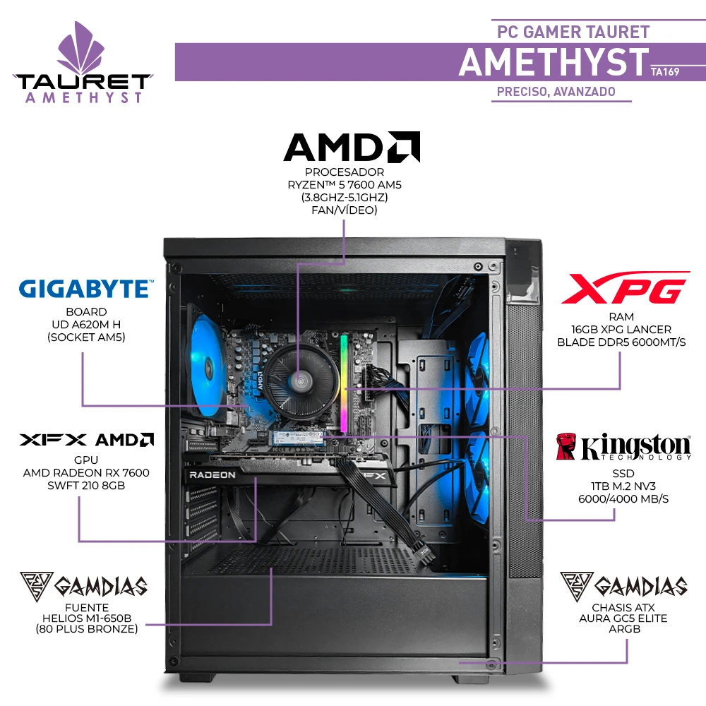 El Amethyst TA169 te abre las puertas a la nueva generación AM5 con un procesador Ryzen 5 7600 y una gráfica Radeon RX 7600 SWFT 210 de 8GB, ideal para jugar en 1080p con fluidez, editar contenido y mantener un sistema veloz y eficiente. Su memoria DDR5 de alta frecuencia junto al SSD de 1TB PCIe 4.0 brindan un entorno de trabajo y juego ágil, estable y con gran capacidad de respuesta.