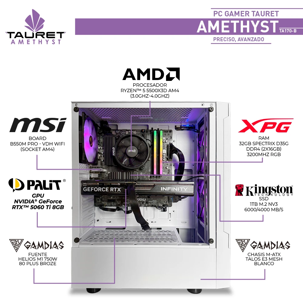 El Amethyst TA170-B combina eficiencia, estabilidad térmica y potencia gráfica en un solo equipo. Equipado con el procesador Ryzen 5 5500X3D, esta versión especial de arquitectura Zen 3 aprovecha una gran caché L3 para ofrecer un rendimiento sorprendente en gaming y tareas intensivas. Además, su nueva NVIDIA GeForce RTX 5060 Ti de 8GB GDDR7 permite disfrutar de títulos AAA en alta calidad con tecnologías como DLSS y Ray Tracing.