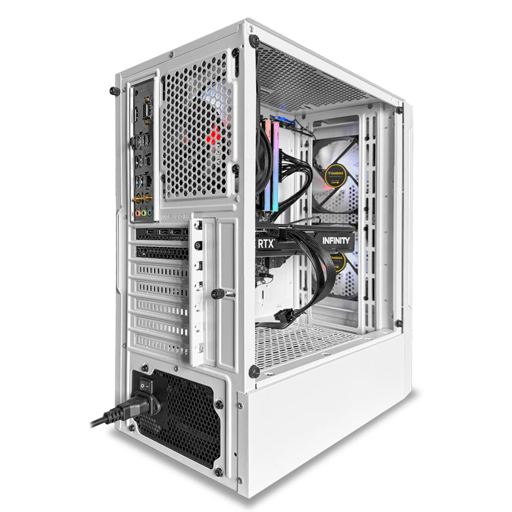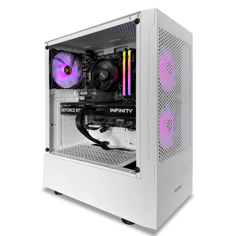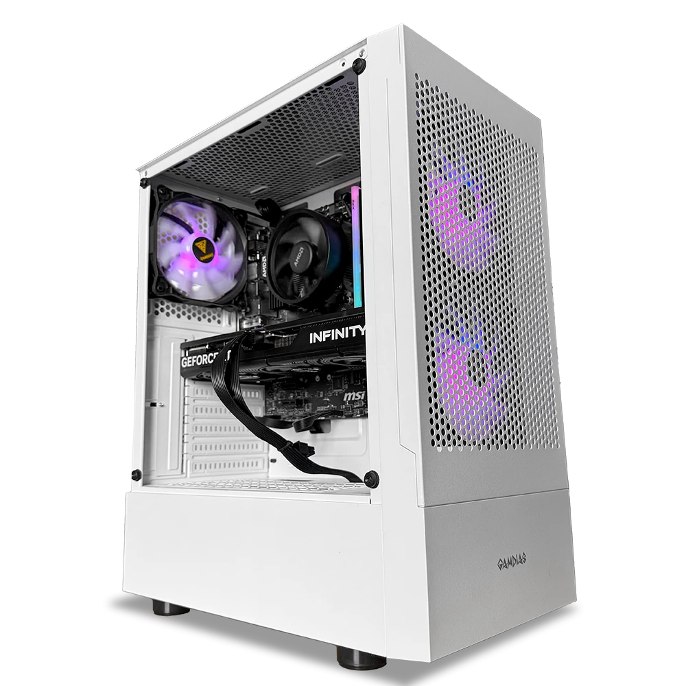 Incluye 32GB de RAM RGB DDR4, almacenamiento PCIe 4.0 NVMe de 1TB y una configuración térmica con tres ventiladores ARGB para mantener temperaturas óptimas incluso en sesiones prolongadas. Todo esto en el chasis Gamdias TALOS E3, con panel lateral en vidrio templado y diseño agresivo ideal para setups gamer.