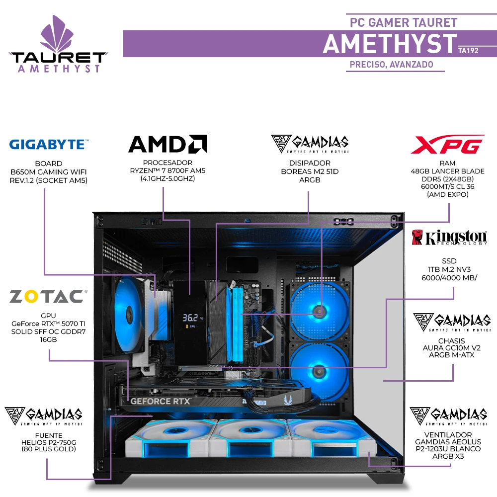 El Tauret Amethyst TA192 está diseñado para usuarios que buscan alto rendimiento en gaming exigente y multitarea avanzada, sobre una plataforma AM5 moderna. Integra el AMD Ryzen™ 7 8700F, un procesador potente y eficiente para cargas intensivas, acompañado por la Zotac Gaming GeForce RTX 5070 Ti SOLID SFF OC de 16GB GDDR7, una gráfica preparada para ofrecer excelente desempeño en títulos actuales, altas tasas de FPS y tecnologías de última generación.