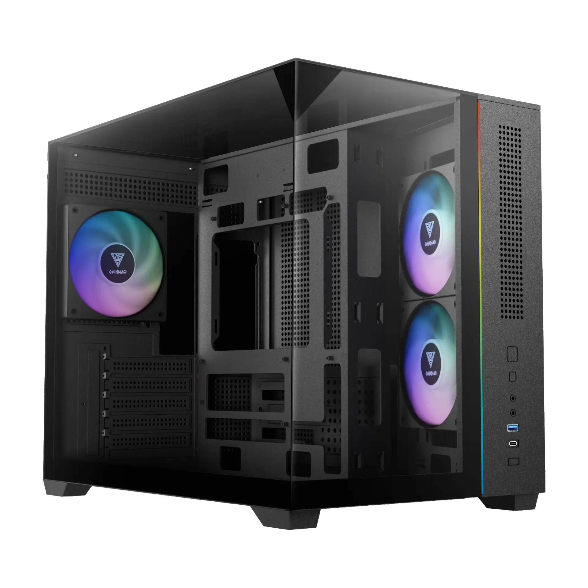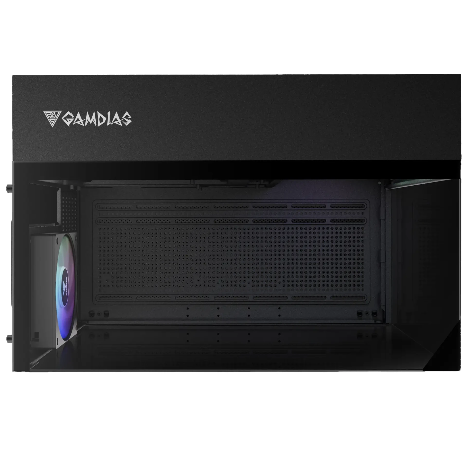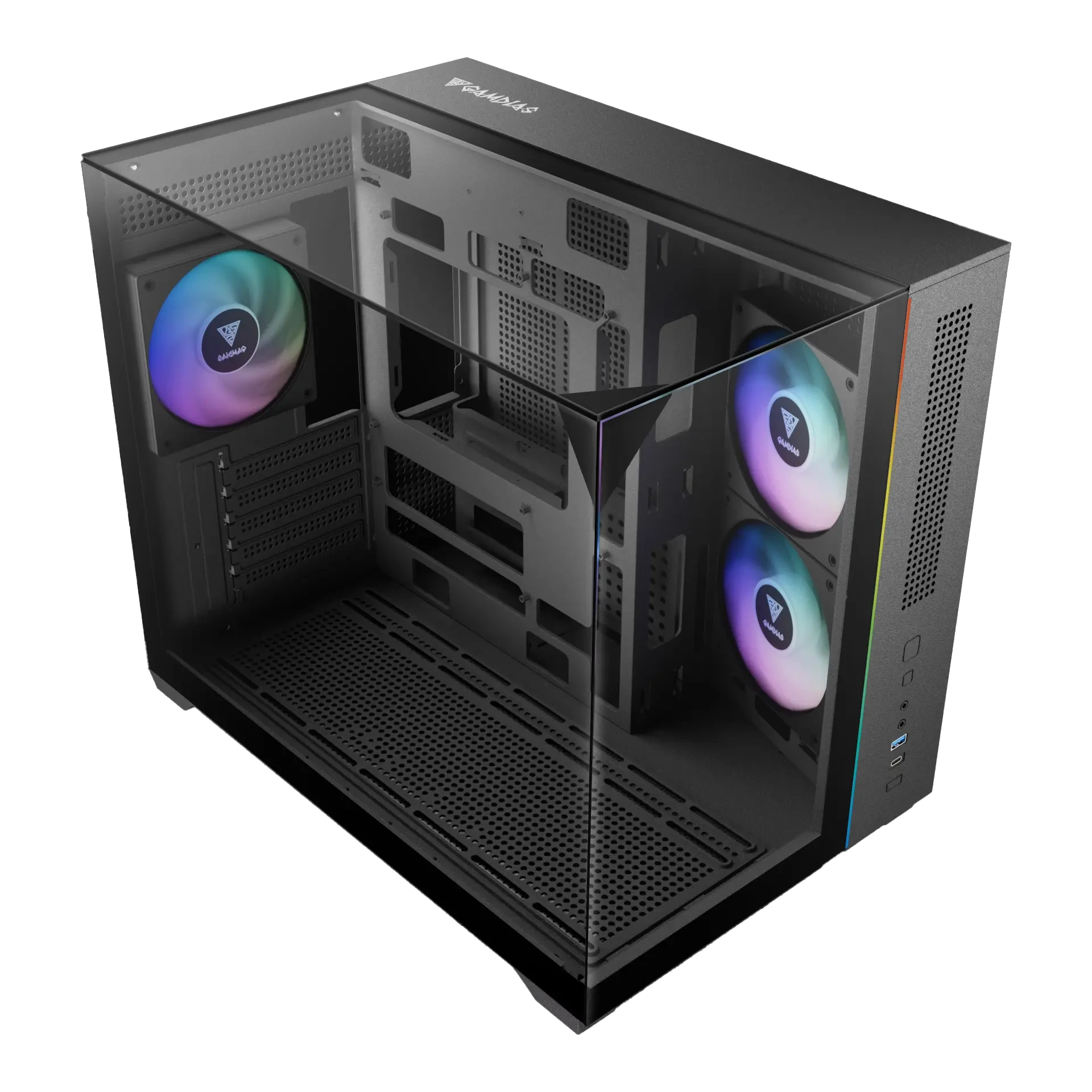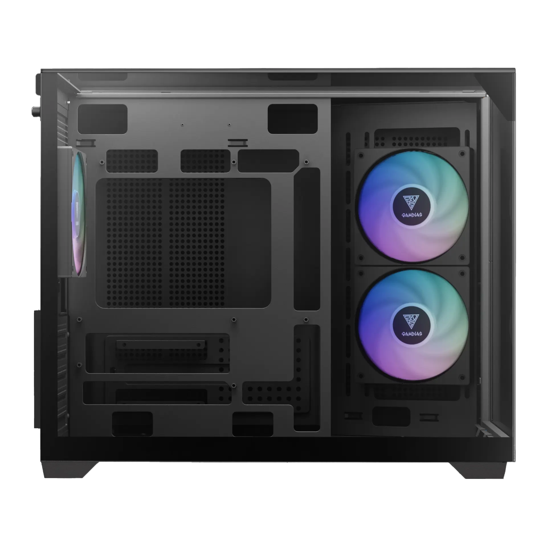 El GAMDIAS ATLAS M3M es un gabinete compacto de alto rendimiento que destaca por su diseño moderno con paneles de vidrio templado en tres lados, ofreciendo una visualización completa del sistema desde múltiples ángulos. Su estructura tipo doble cámara mejora la organización interna y permite un flujo de aire más eficiente.
