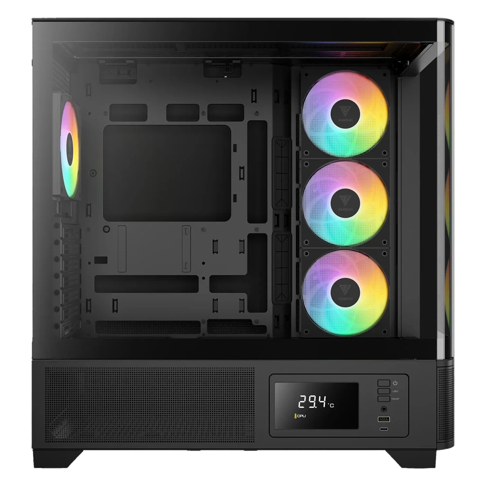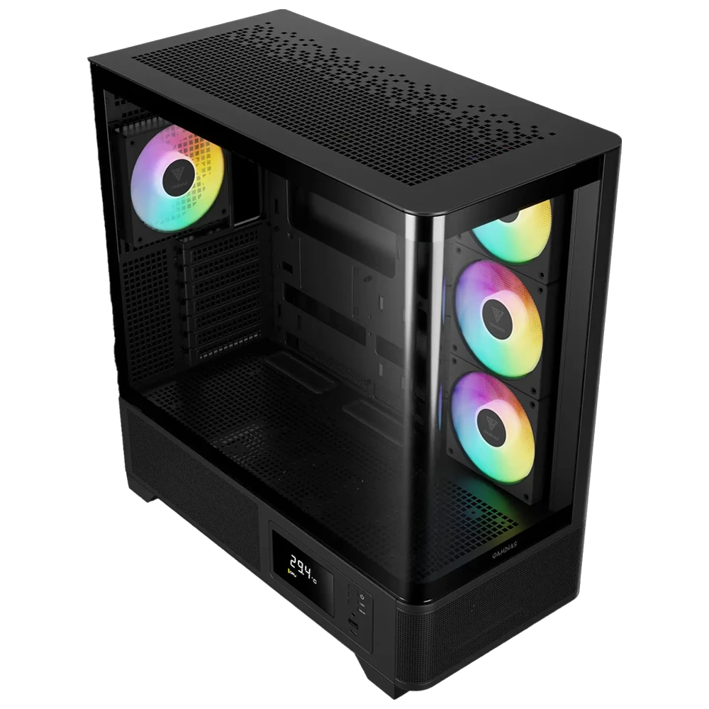 Además, incorpora 4 ventiladores ARGB PWM preinstalados, junto a un hub de control que facilita la sincronización de iluminación y flujo de aire, garantizando un sistema eficiente, silencioso y listo para gaming exigente. También incluye una pantalla integrada para monitoreo en tiempo real, donde puedes visualizar temperatura del CPU, GPU y ambiente directamente desde el gabinete.