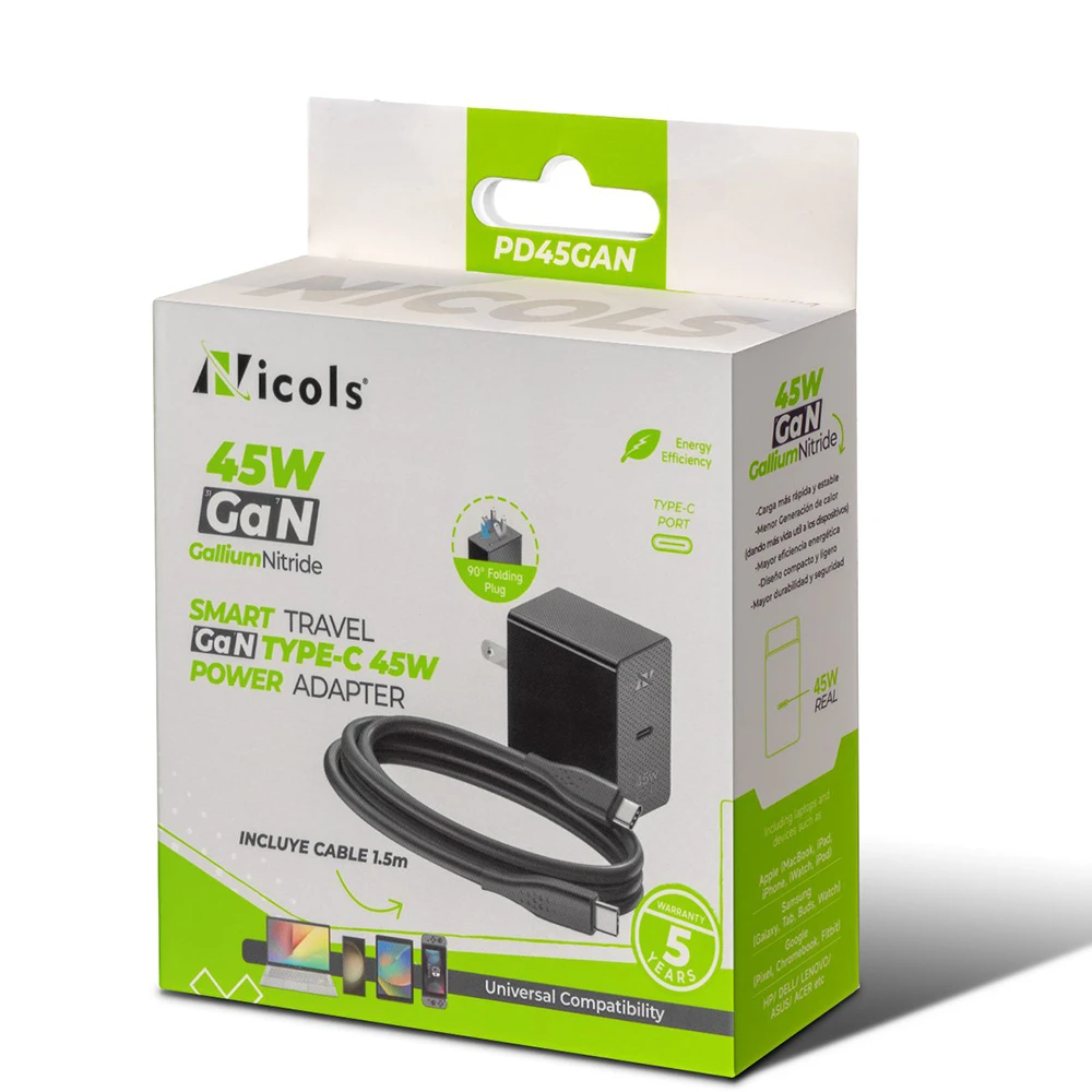 El cargador USB Tipo C GaN 45W NICOLS está diseñado para ofrecer una carga rápida, eficiente y segura en un formato compacto. Gracias a la tecnología GaN (nitruro de galio), permite una mejor gestión de la energía, menor generación de calor y un tamaño más reducido en comparación con cargadores tradicionales.