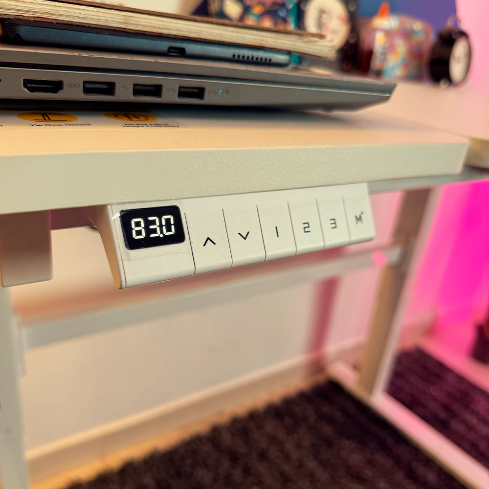 Ajuste eléctrico de altura (56–80 cm) que permite alternar entre posiciones sentado y de pie, ayudando a mejorar la postura y reducir la fatiga.