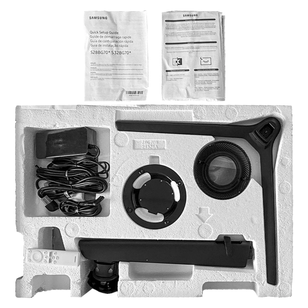 Cable de alimentación, base original, adaptador de corriente, control remoto y manuales.