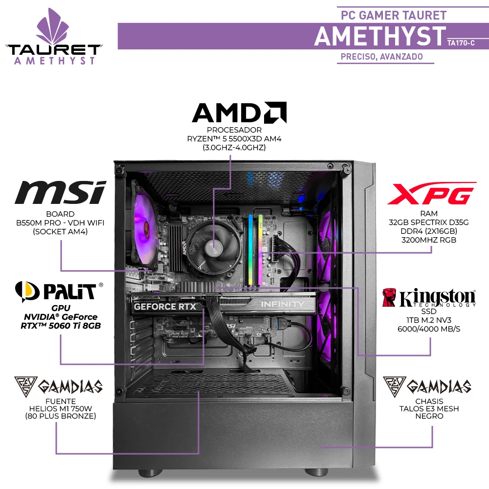 El Amethyst TA170-C combina eficiencia, estabilidad térmica y potencia gráfica en un solo equipo. Equipado con el procesador Ryzen 5 5500X3D, esta versión especial de arquitectura Zen 3 aprovecha una gran caché L3 para ofrecer un rendimiento sorprendente en gaming y tareas intensivas. Además, su nueva NVIDIA GeForce RTX 5060 Ti de 8GB GDDR7 permite disfrutar de títulos AAA en alta calidad con tecnologías como DLSS y Ray Tracing.