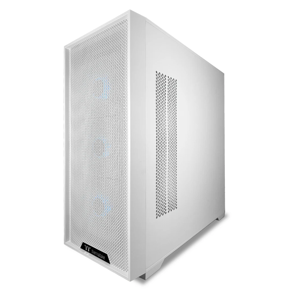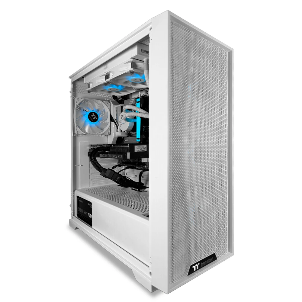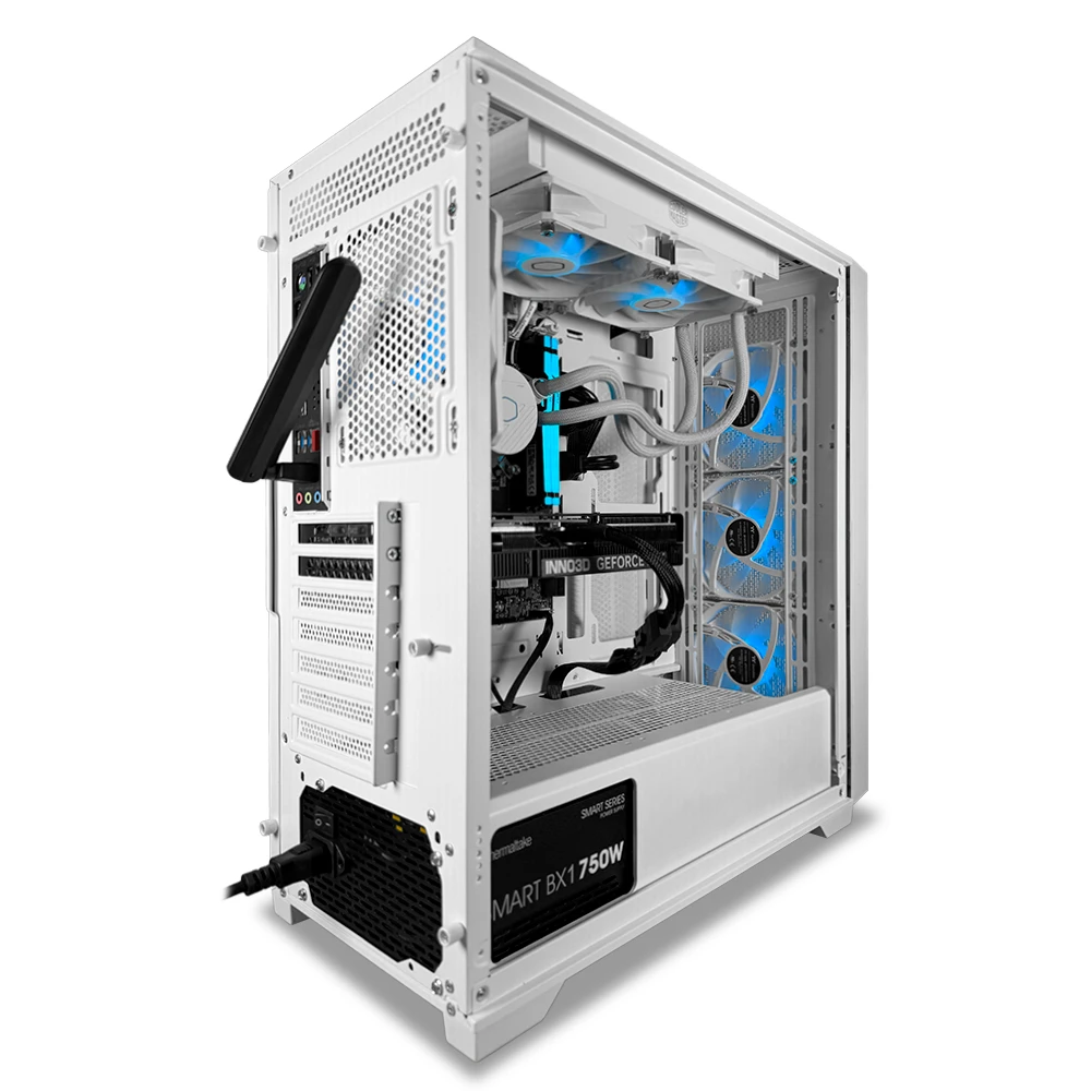 Acompañan al sistema 32GB de RAM Kingston DDR5 a 5600MT/s RGB y un SSD Crucial P3 Plus de 1TB para asegurar arranques veloces y tiempos de carga mínimos. El conjunto se mantiene refrigerado por un Cooler Master MasterLiquid 240L Core ARGB en blanco, montado dentro del chasis Thermaltake H390 TG ARGB, que incorpora panel de vidrio templado, amplio flujo de aire y estética impactante.