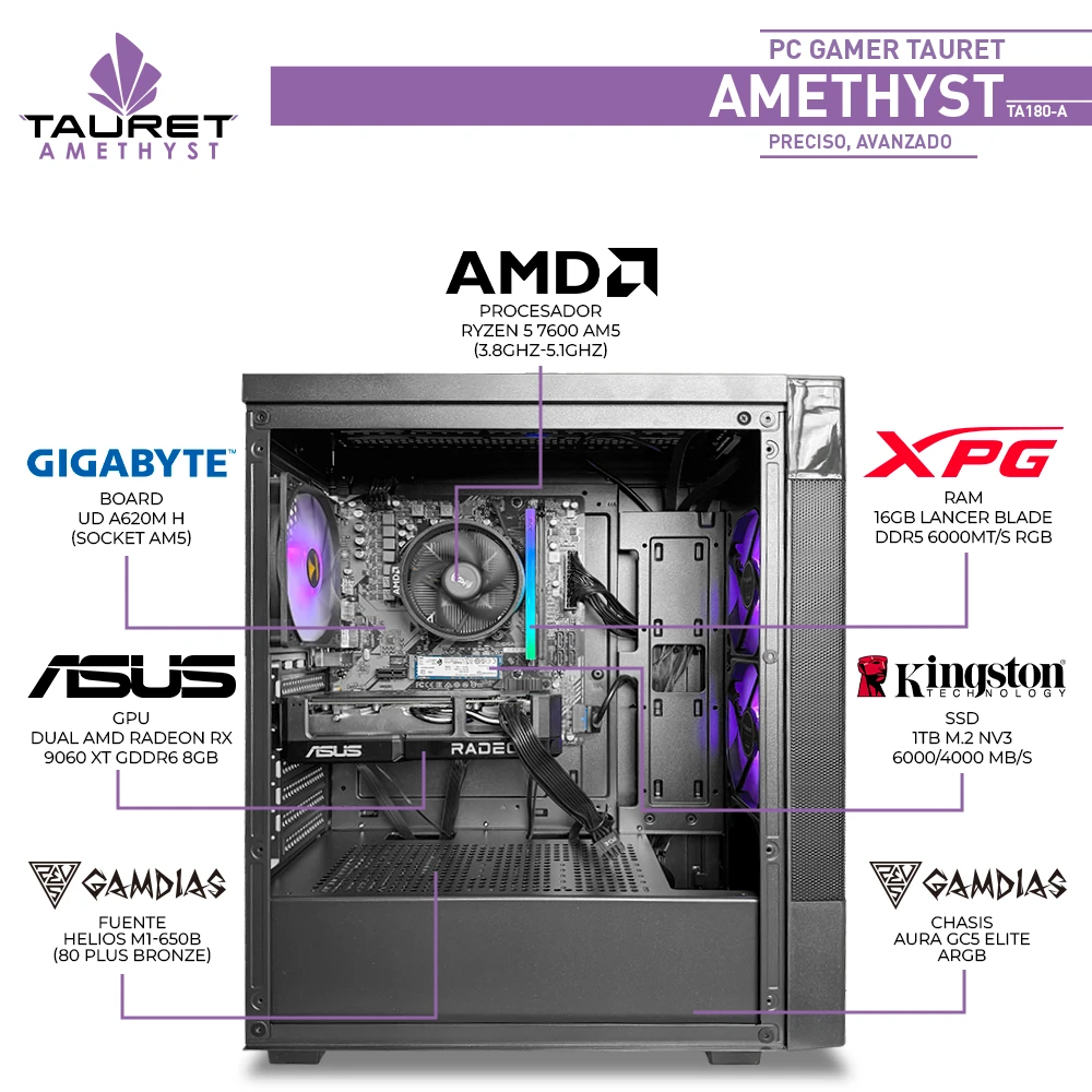 PC Gamer Tauret Amethyst TA181-A AMD Ryzen 5 7600 RX 9060 XT 8GB RAM 16GB M.2 1TB