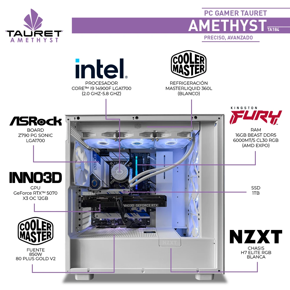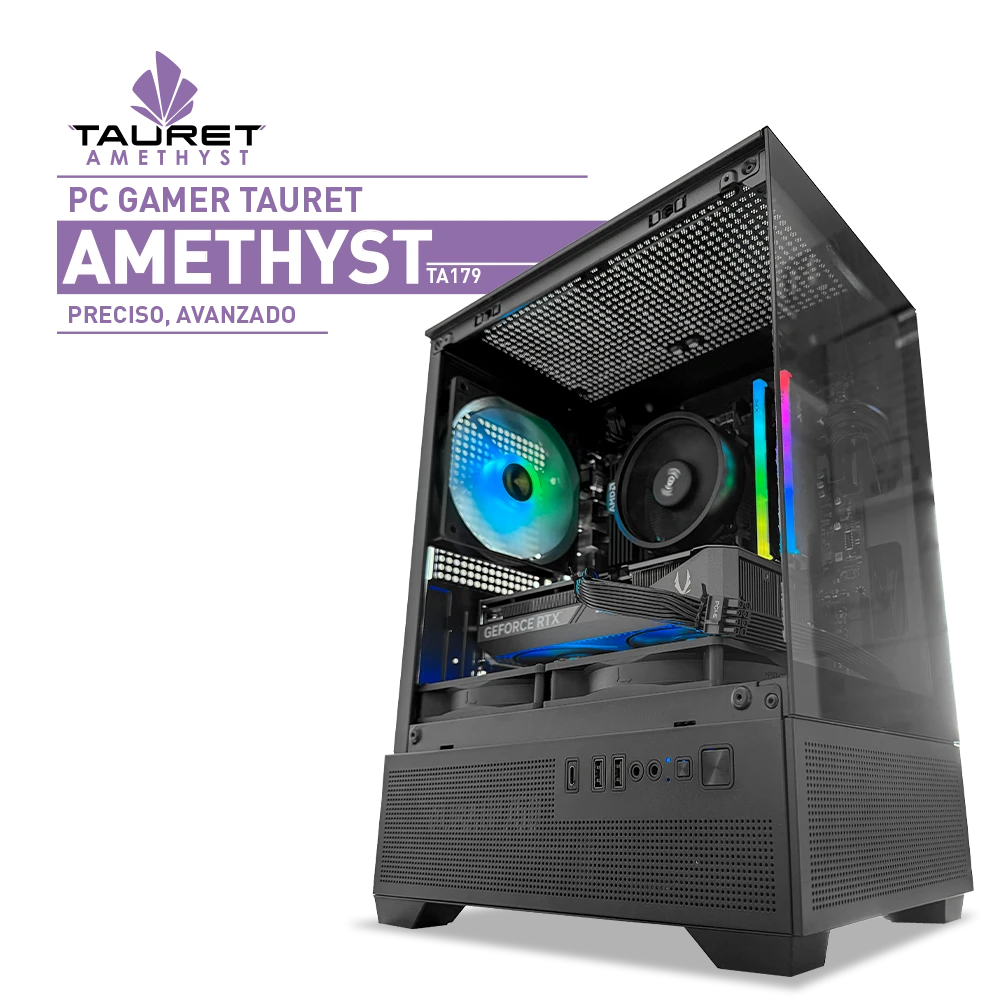 El Tauret Amethyst TA184 está pensado para usuarios que buscan alto rendimiento en gaming y tareas exigentes, con componentes de última generación. Incorpora el Intel® Core™ i9-14900F, un procesador diseñado para cargas intensivas y multitarea avanzada, junto a la INNO3D GeForce RTX 5070 X3 OC de 12GB, ideal para jugar títulos modernos con alta calidad gráfica, Ray Tracing y tecnologías actuales de aceleración.