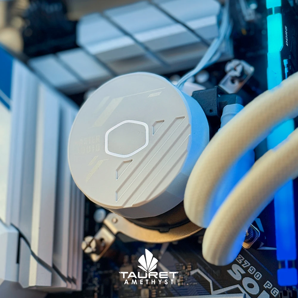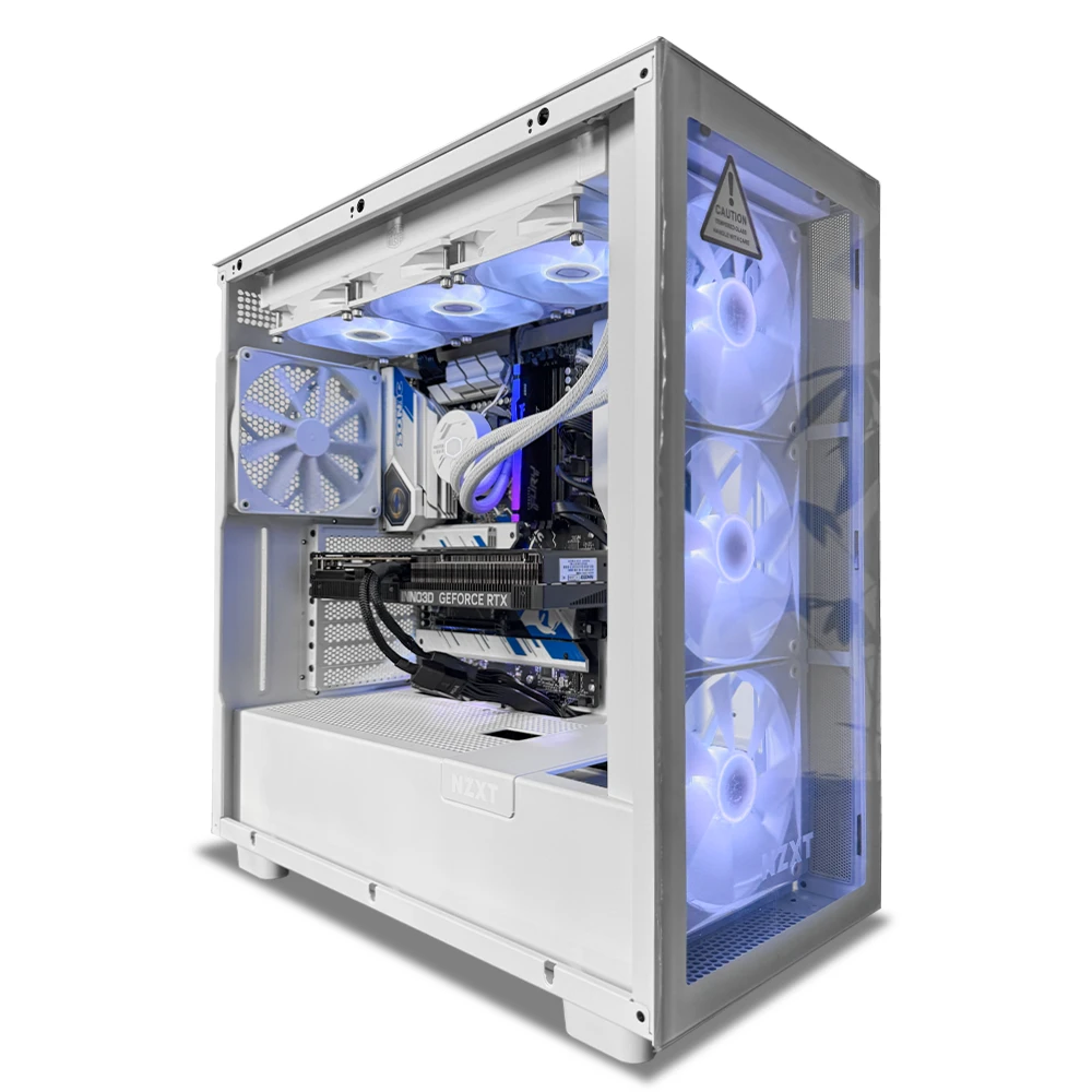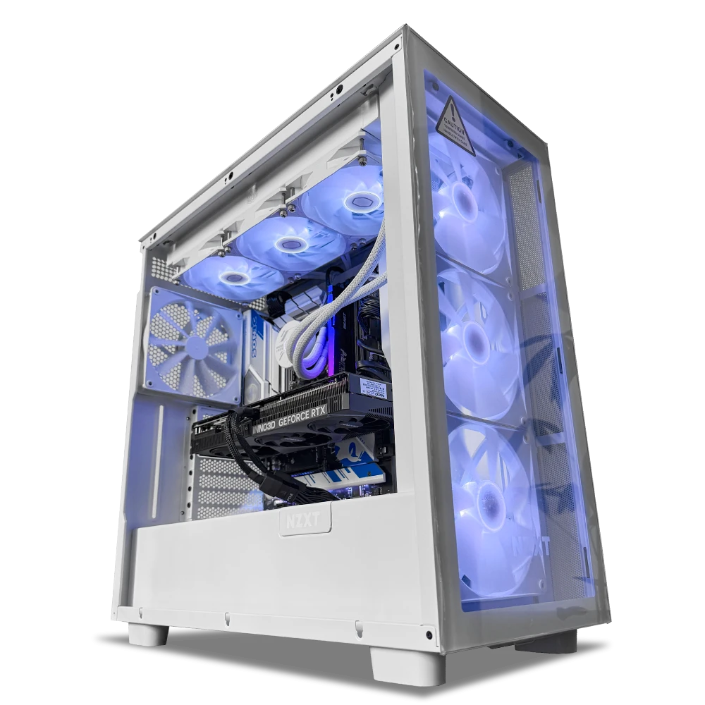 El sistema se complementa con 16GB de memoria DDR5 a 6000MT/s con RGB, 1TB de almacenamiento sólido para respuestas rápidas y una refrigeración líquida Cooler Master MasterLiquid 360L en color blanco, que mantiene temperaturas estables bajo uso prolongado. Todo se ensambla en el NZXT H7 Elite RGB blanco, con vidrio templado y ventilación ARGB (3 ventiladores frontales y 1 trasero), alimentado por una fuente Cooler Master 850W 80 Plus Gold para máxima estabilidad.