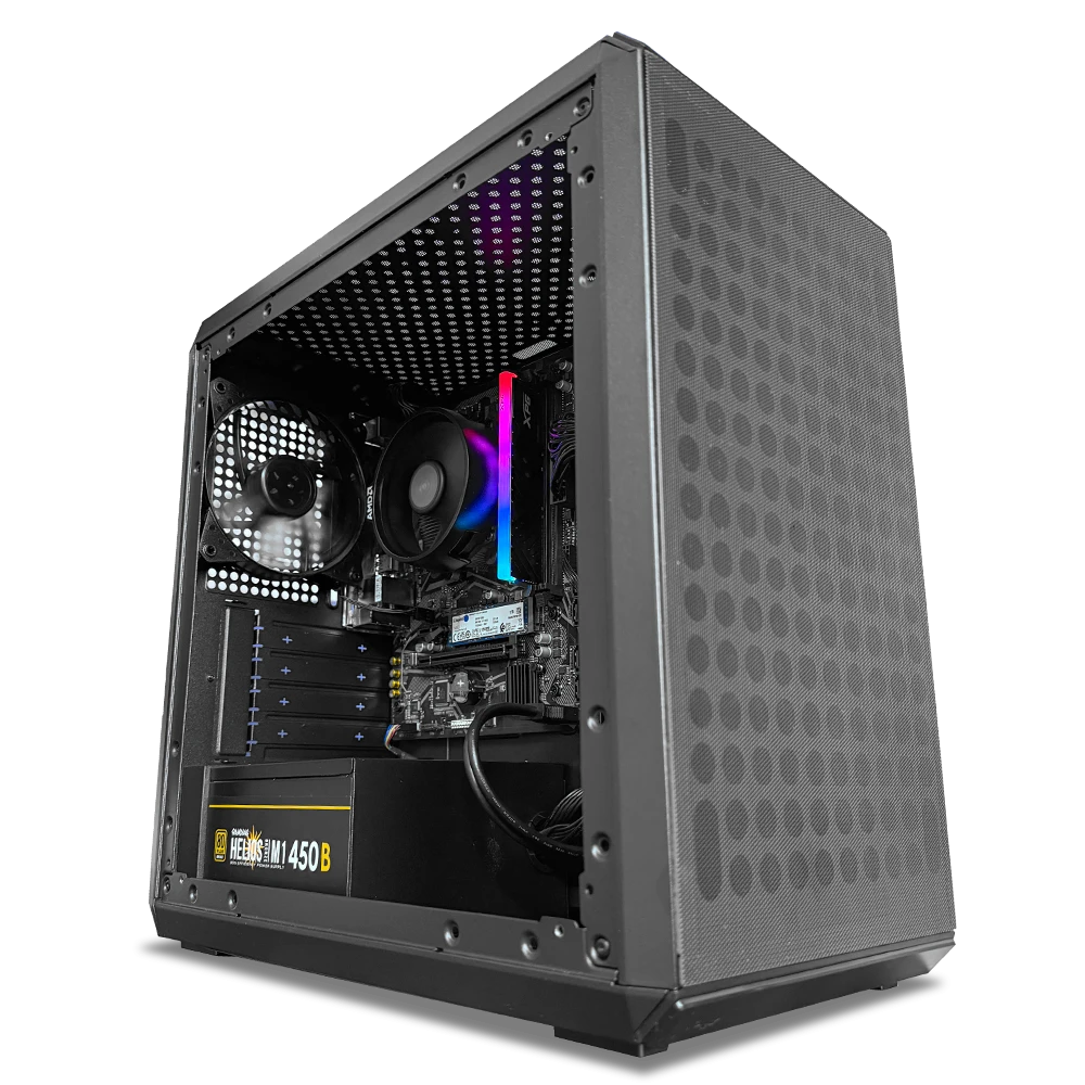 Este PC cuenta con 16GB de memoria DDR4 a 3200MHz con iluminación RGB, 1TB de almacenamiento M.2 NVMe para arranques y cargas rápidas, y una refrigeración confiable mediante el AMD Wraith Stealth. Todo se ensambla en el Cooler Master Q300L V2 M-ATX en color negro, un chasis compacto y funcional, con ventilador trasero ARGB de 120 mm que asegura flujo de aire adecuado. La energía está a cargo de una fuente Gamdias Helios M1 de 450W 80 Plus Bronze, pensada para un funcionamiento estable y eficiente.