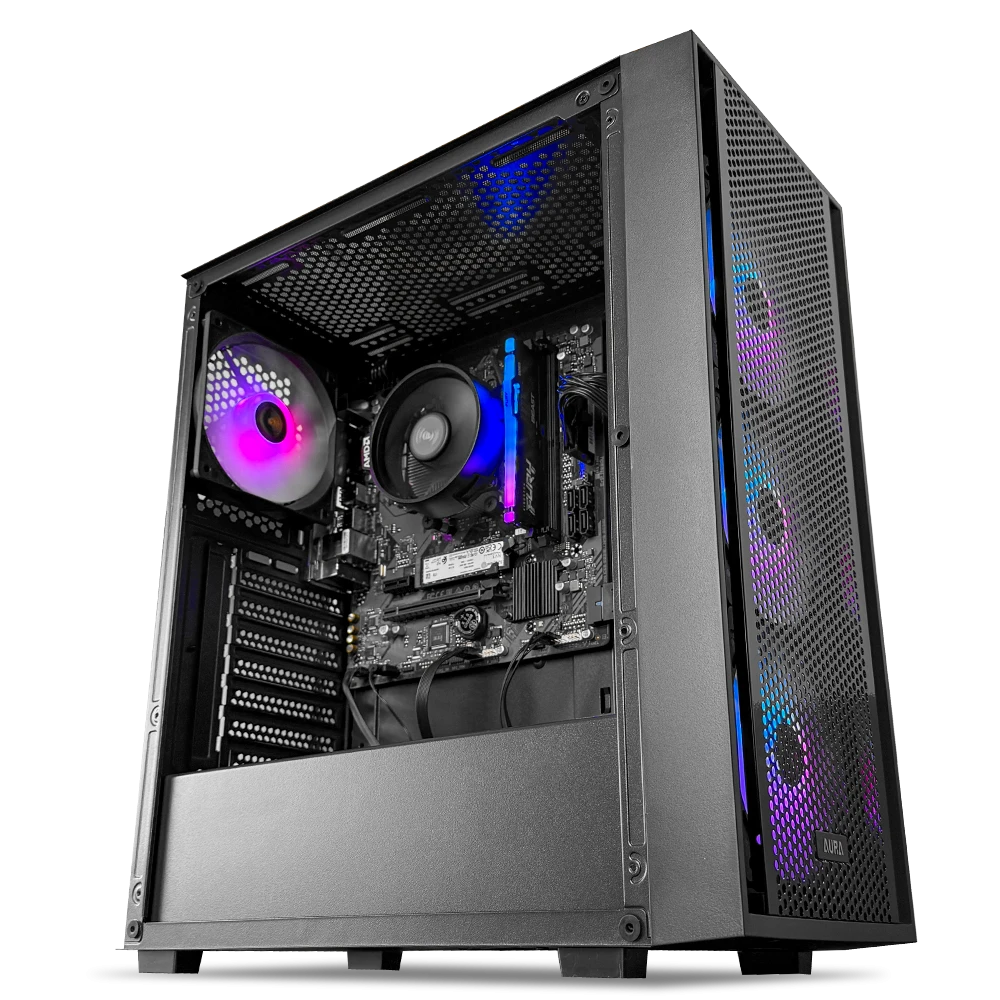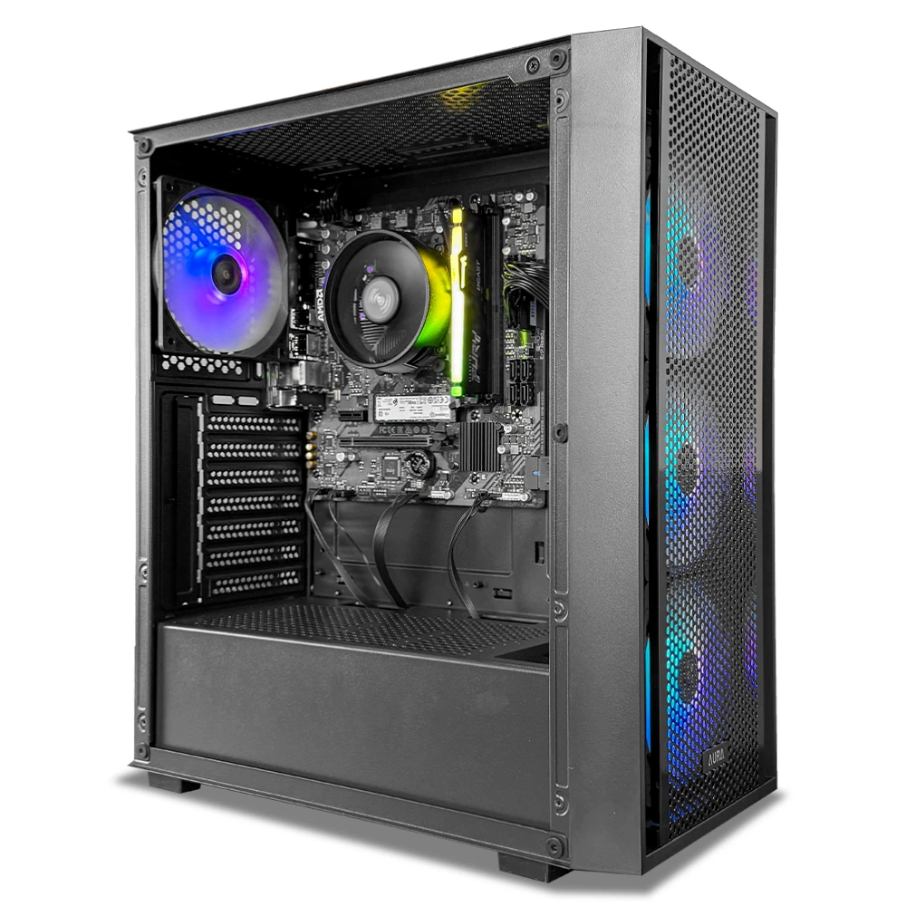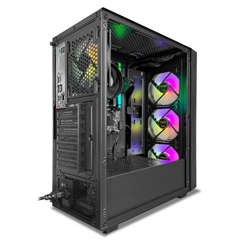 Este equipo incorpora 16GB de memoria DDR5 a 6000MT/s con perfil AMD EXPO, 1TB de almacenamiento M.2 NVMe Kingston NV3 para tiempos de carga rápidos y refrigeración mediante el AMD Cooler. Todo se ensambla en el Gamdias AURA GC2 ELITE ARGB ATX, con 3 ventiladores frontales y 1 trasero de 120 mm que aseguran un buen flujo de aire, alimentado por una fuente Gamdias Helios M1 de 650W 80 Plus Bronze para un funcionamiento estable.