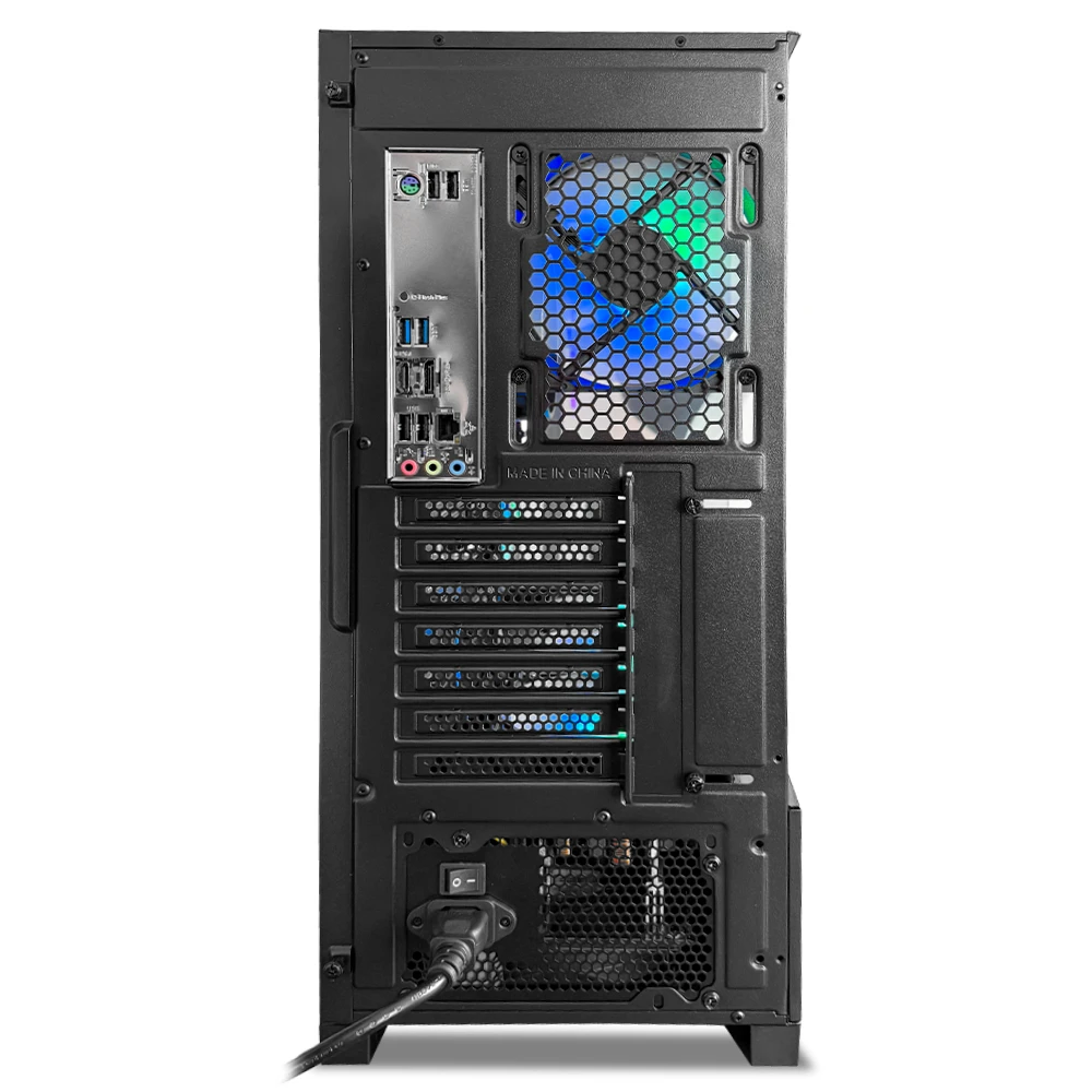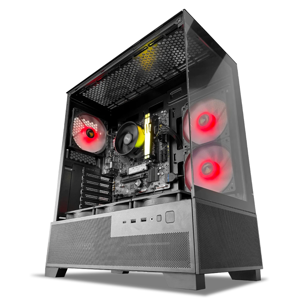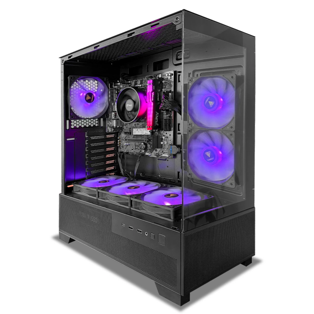 Este equipo incorpora 16GB de memoria DDR5 (2x8GB) a 5600MT/s con perfil AMD EXPO y RGB, 1TB de almacenamiento M.2 NVMe Kingston NV3 para tiempos de carga rápidos y refrigeración mediante el cooler AMD Wraith Stealth. Todo se ensambla en el Gamdias AURA GC12 ARGB M-ATX, con una configuración de 6 ventiladores de 120 mm (2 laterales, 3 inferiores y 1 trasero) que optimizan el flujo de aire interno, alimentado por una fuente Gamdias Helios M1 de 550W 80 Plus Bronze para un funcionamiento estable.
