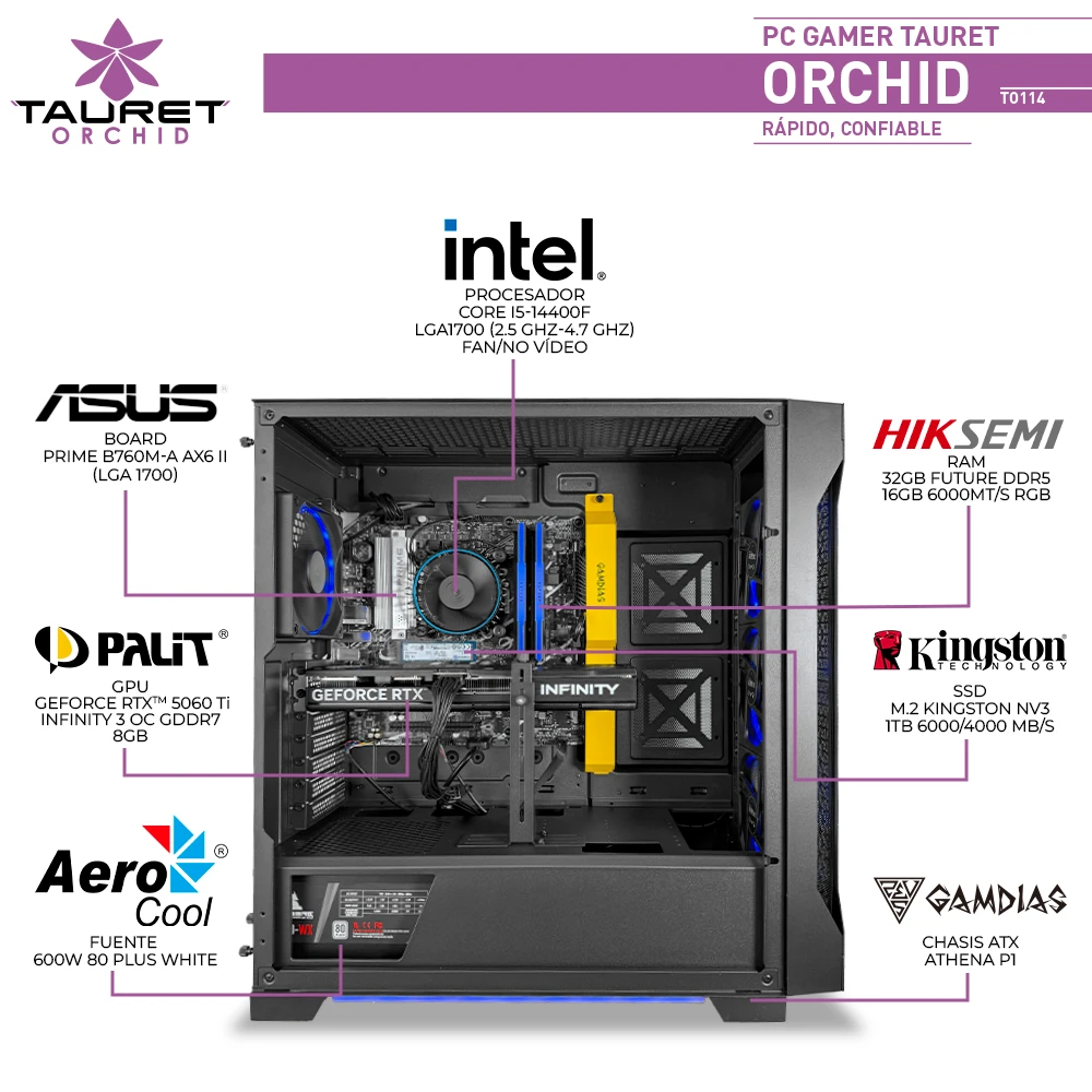 PC Gamer Tauret Orchid TO114 INTEL CORE I5 -14400F RTX 5060 Ti 8GB RAM 32GB M.2 1TB