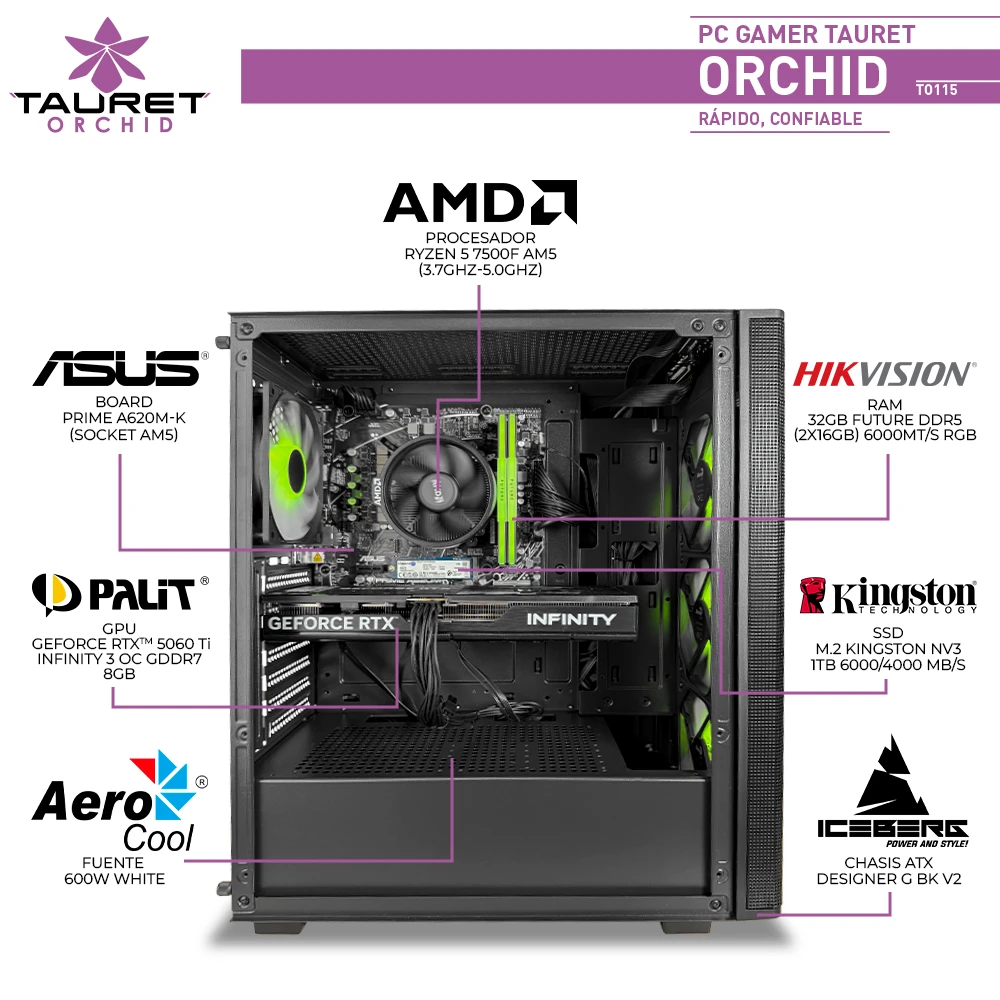 El Tauret Orchid TO115 es un equipo ideal para quienes buscan rendimiento gráfico moderno y alta capacidad de respuesta sin comprometer el estilo. Con el procesador AMD Ryzen 5 7500F de 6 núcleos y la tarjeta gráfica PALIT GeForce RTX 5060 Ti Infinity 3 OC de 8GB GDDR7, este equipo ofrece fluidez en juegos competitivos, herramientas de edición y entornos multitarea.