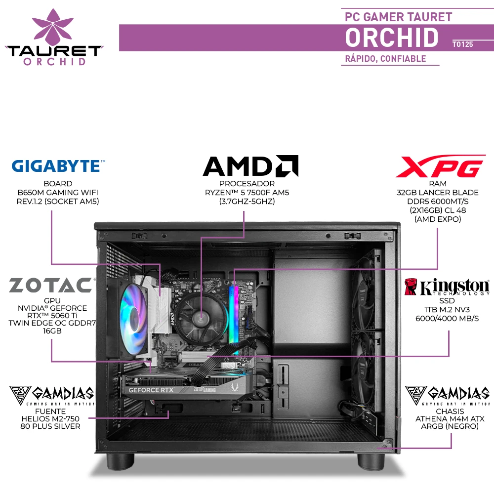 El Tauret Orchid TO125 está diseñado para usuarios que buscan alto rendimiento en gaming moderno, con una configuración equilibrada sobre plataforma AM5. Integra el AMD Ryzen™ 5 7500F, un procesador eficiente enfocado en rendimiento puro, acompañado por la Zotac GeForce RTX 5060 Ti Twin Edge OC de 16GB GDDR7, una gráfica ideal para jugar títulos actuales con alta calidad gráfica y tecnologías como Ray Tracing.