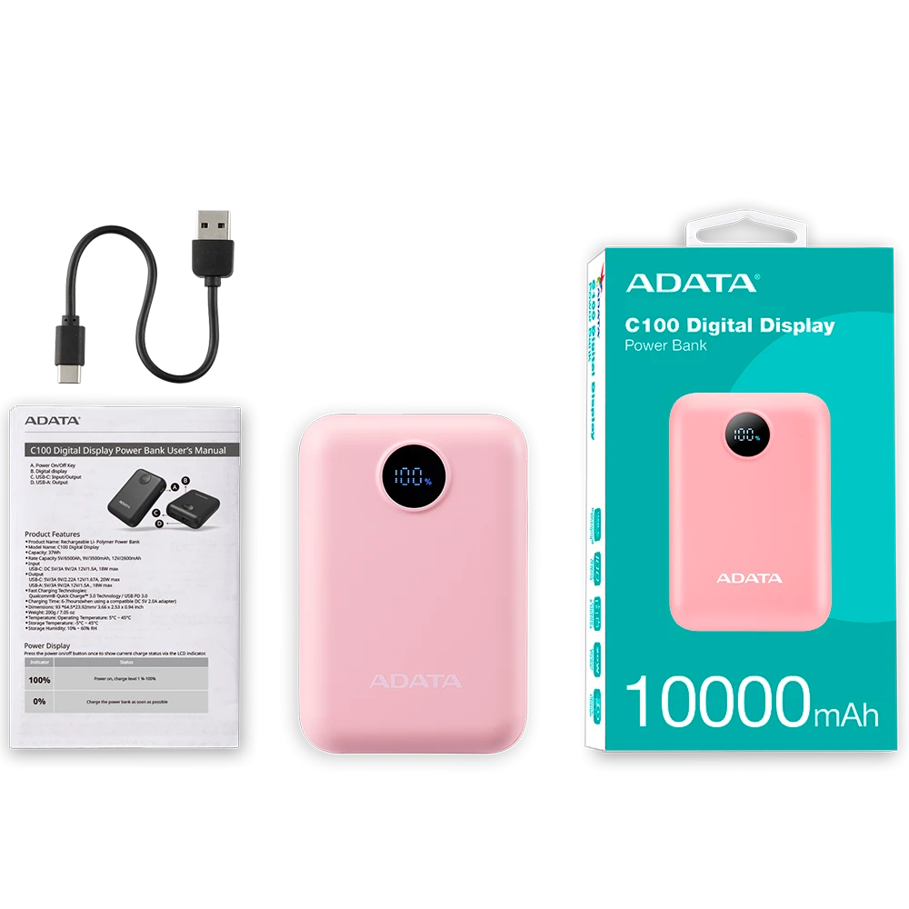 El ADATA C100 Power Bank con pantalla digital es una batería portátil diseñada para ofrecer carga confiable y práctica en cualquier lugar. Su diseño compacto facilita llevarlo en el bolsillo o bolso, mientras que su pantalla digital integrada permite visualizar con precisión el nivel de batería restante.