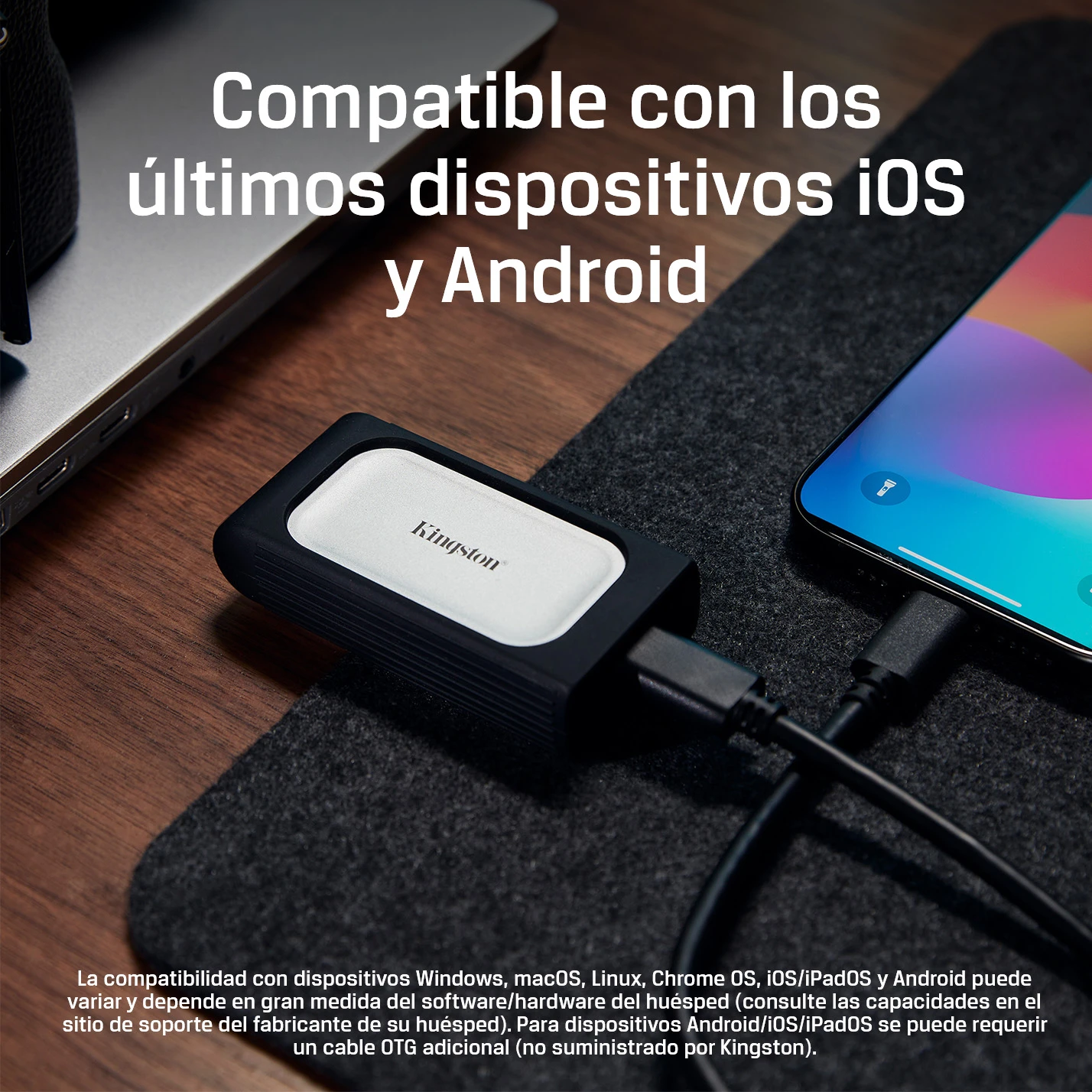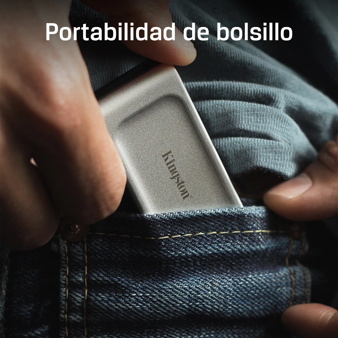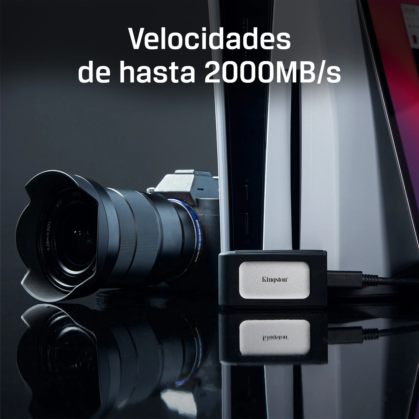 El disco SSD portátil XS2000 de Kingston utiliza velocidades de USB 3.2 Gen 2x2 para ofrecer un rendimiento de nueva generación en una compacta unidad externa. Con velocidades de transferencia apabullantes de hasta 2.000 MB/s, el xs2000 posibilita incrementar la productividad con mínimas interrupciones. El xs2000 ofrece opciones de almacenamiento a alta velocidad para descargar y editar imágenes de alta resolución, vídeos 8K y documentos voluminosos en un santiamén. Con hasta 4 TB de capacidad portátiles, podrás guardar tus juegos y contenidos multimedia favoritos sin problemas. La unidad está preparada para futuros avances con el objeto de mantenerse al día con las necesidades de almacenamiento. Es compatible de serie con la mayoría de los dispositivos. Funciona exactamente igual que un disco duro, con la diferencia de que almacena datos utilizando tecnología Flash NAND. Se conecta con USB Tipo-C, con lo cual los creadores de contenidos y jugadores pueden acceder a sus datos desde cualquier lugar. Sea dondequiera que te encuentres entre el trabajo, el juego y los proyectos que te apasionen, el xs2000 incluye una resistente funda extraíble y tiene un grado de protección IP55 para resistir el agua y el polvo, lo cual lo convierte en la herramienta perfecta para sesiones de fotos in situ o aventuras.